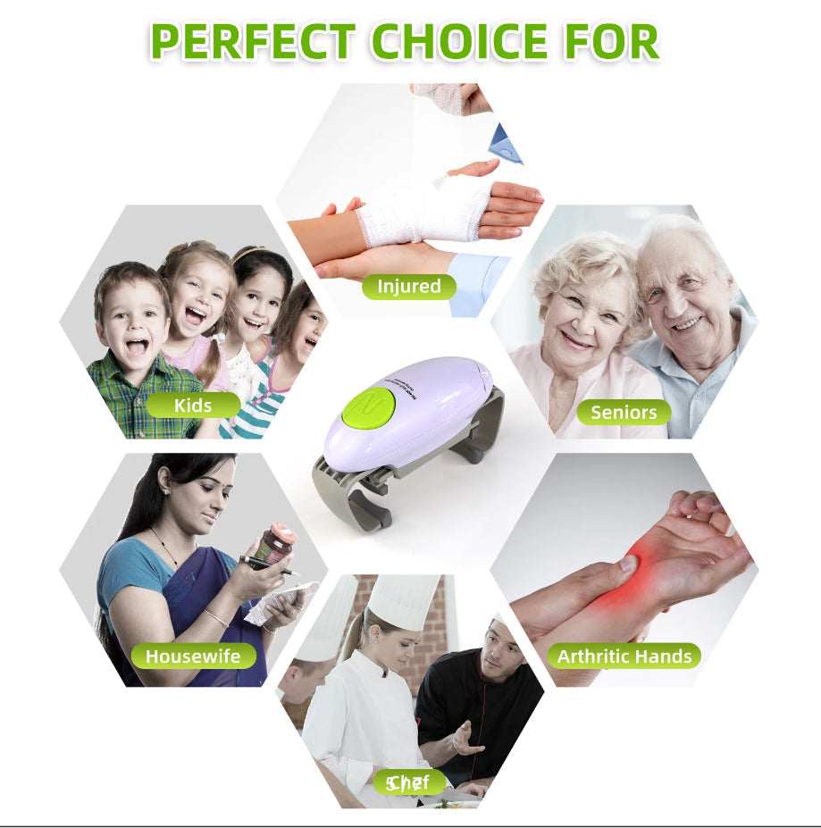 - Fácil de usar: Abre tarros y botellas con solo presionar un botón, sin necesidad de esfuerzo.